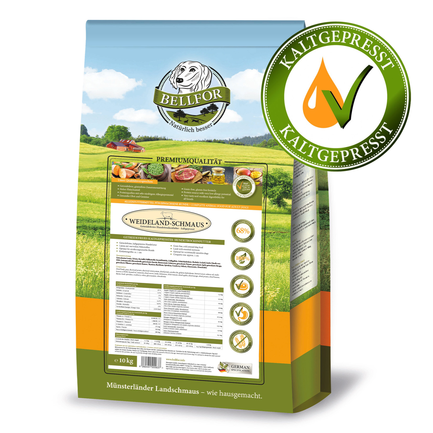 Bellfor Weideland-Schmaus (beitefest) er et kornfritt tørrfôr av høy kvalitet for hunder. En oppskrift utviklet kun av naturlige ingredienser og høyt kjøttinnhold sikrer en utmerket smak og vil tilføre hunden alle de næringsstoffer som måtte trenges helt optimalt.