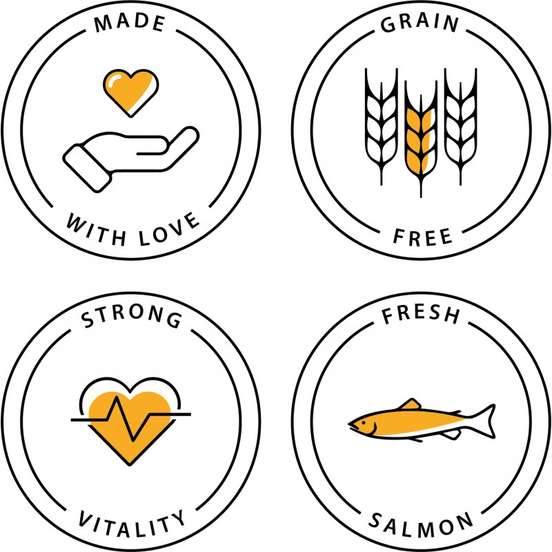 Tørket laks (26,6%), fersk laks (20%), erter (12%), fjærfefett, tørket potet (9%), potetstivelse (9%), tørket betemasse (avsukket), ølgjær, hydrolysert kyllinglever , tørket johannesbrød, lakseolje, inulin (kilde til FOS), linolje, tørket gulrot (0,15%), tørket tomat (0,15%), tørket eple (0,15%), tørket mango (0,15%), tørket plomme (0,15% ), tørket banan (0,15%), Spirulina (0,15%), tranebær (0,15%), selleri (0,15%).
